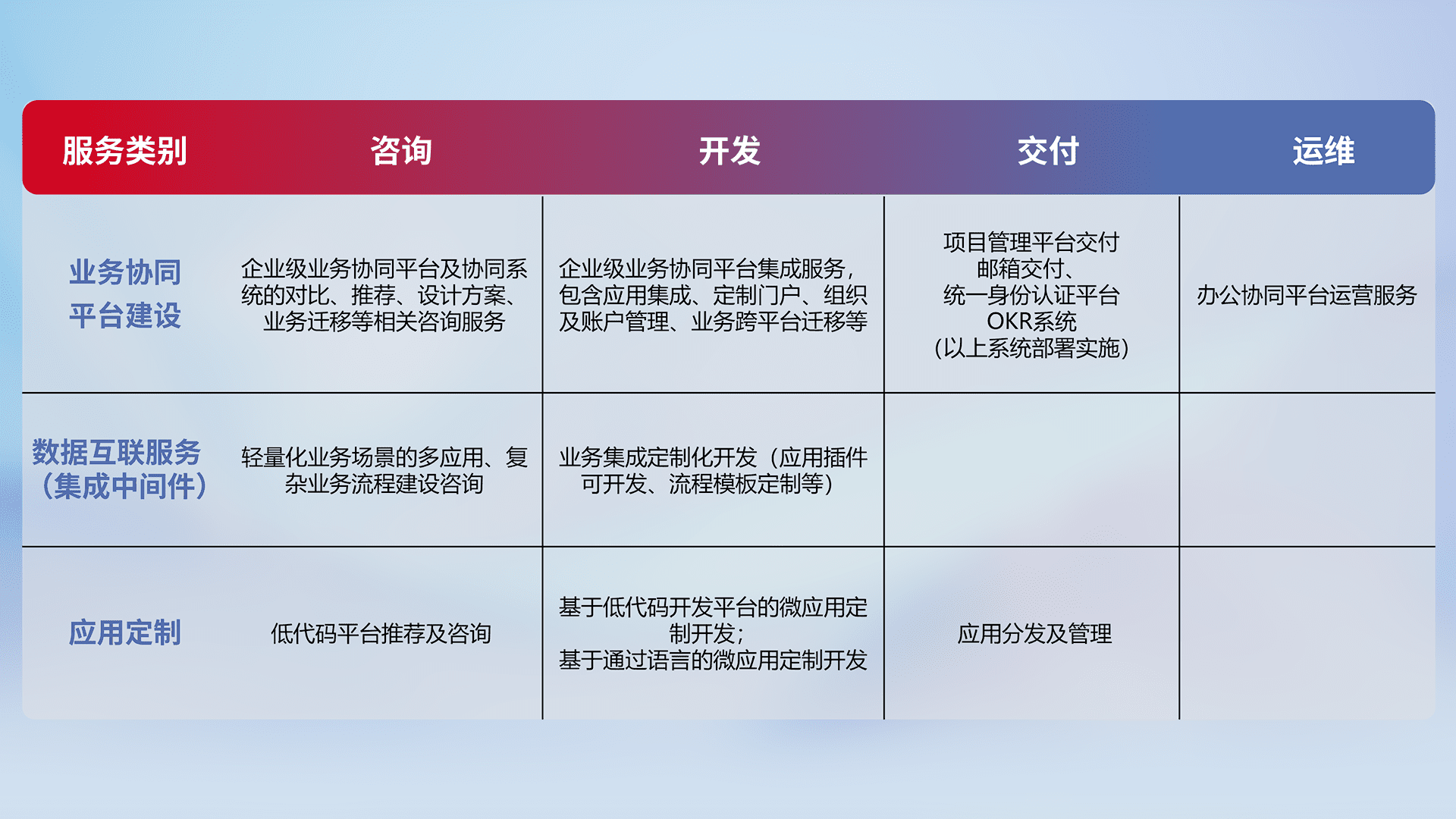 针对钉钉、、、企微、、、IDaas等平台级产品提供产品的规划、、、、方案、、、交付、、定制化开发等服务,,,,实现如统一协同办公、、智能客户服务、、、混合会议管理、、智能数据查询、、等业务场景,,实现数字化转型。。